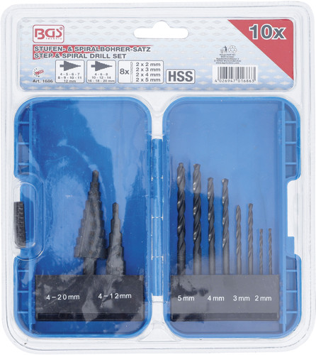 BGS 1686 Stufenbohrer- und Spiralbohrer-Satz | HSS | 4 - 12 / 4 - 20 mm | 2 - 5 mm | 10-tlg.