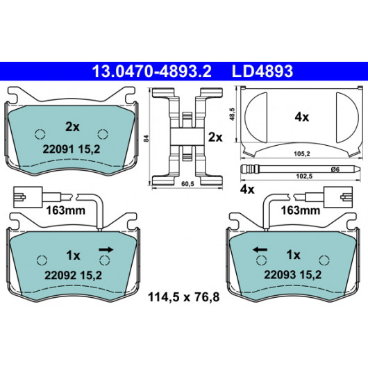 Breite [mm]: 114,5 | Höhe [mm]: 76,8 | Dicke/Stärke [mm]: 15,2 | Verschleißwarnkontakt: mit integriertem Verschleißwarnkontakt | Warnkontaktlänge [mm]: 163 | Anzahl Verschleißanzeiger [pro Achse]: 2 | Ergänzungsartikel/Ergänzende Info 2: mit Anti-Quietsch-Blech | Ergänzungsartikel/Ergänzende Info: mit Zubehör | Bremssystem: Brembo | Prüfzeichen: E1 90R-02A0479/0451 | MAPP-Code vorhanden: 1