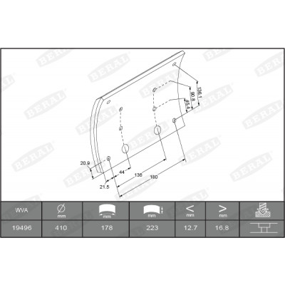 Qualität: 3672F | Dicke/Stärke [mm]: 18,3 | Prüfzeichen: E9-90R-01.1058/1101 | Breite [mm]: 223 | Gewicht[kg]: 9,04 | Radius [mm]: 200 | Trommeldurchmesser: 410 | Nietart: 8x18 | Nietanzahl pro Belagsatz: 64 | Bohrbild/Lochzahl: 8 | Verschleißwarnkontakt: für Verschleißwarnanzeiger vorbereitet | Bremsbelag: mit Sichelbelag, 1.Übermaß | Länge außen [mm]: 192 | Länge innen [mm]: 177 | Verpackungslänge [cm]: 19,4 | Verpackungsbreite [cm]: 15,8 | Verpackungshöhe [cm]: 22,4