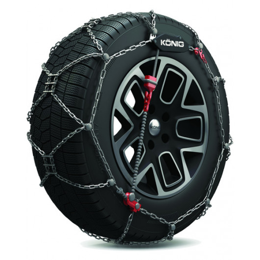 Die König XG Cross verfügt über ein Bodenmontagesystem: Dank des flexiblen Kabels, das hinter dem Reifen auf den Boden gleitet, werden alle Kettenteile verbunden, ohne das Fahrzeug zu bewegen. Sobald die Schneekette auf dem Reifen montiert ist, benötigt sie keinen zusätzlichen Stopp zum Nachspannen. Vielmehr wird dank des ATC-Systems von König die optimale Spannung und Zentrierung der Kette auf dem Reifen automatisch während der Fahrt erreicht.