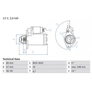 Austauschteil: 1 | Spannung [V]: 12 | Starterleistung [kW]: 2 | Anzahl der Befestigungsbohrungen: 0 | Anzahl der Gewindebohrungen: 2 | Zähnezahl: 10 | Klemme: 50, 30 | Flansch-Ø [mm]: 60 | Drehrichtung: Drehrichtung im Uhrzeigersinn | Ritzel-Grundposition [mm]: 27,4 | Starterausführung: eigengelagert | Gewindemaß: M10 | Gewindemaß 1: M10 | Länge [mm]: 248 | Lage/Grad: links | Befestigungswinkel [Grad]: 12 | Winkelmaß Maulöffnung [Grad]: 0 | Winkelmaß Befestigungsbohrung [Grad]: 12