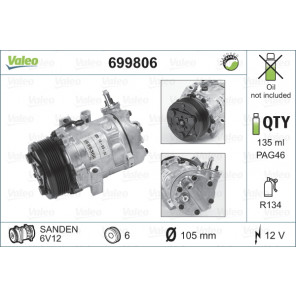 Austauschteil: 1 | Herstellereinschränkung: SANDEN | Kompressor-ID: SD6V12 | Kältemittel: R 134a | Spannung [V]: 12 | Inhalt [ml]: 135 | Riemenscheiben-Ø [mm]: 105 | Anzahl der Rillen: 6 | Hubraum-Kompressor [ccm]: 120 | Ergänzungsartikel/Ergänzende Info 2: ohne PAG-Kompressoröl | Kompressoröl: PAG 46 | Gewicht[kg]: 5,23