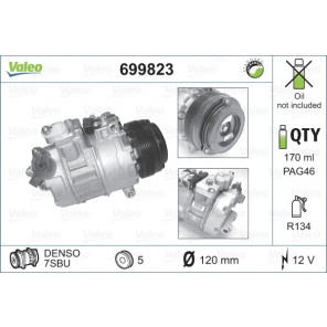 Austauschteil: 1 | Herstellereinschränkung: DENSO | Kompressor-ID: 7SBU | Kältemittel: R 134a | Spannung [V]: 12 | Inhalt [ml]: 170 | Riemenscheiben-Ø [mm]: 120 | Anzahl der Rillen: 5 | Ergänzungsartikel/Ergänzende Info 2: ohne PAG-Kompressoröl | Kompressoröl: PAG 46 | Gewicht[kg]: 7