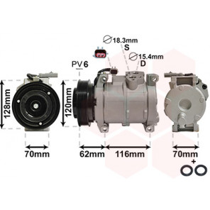 Herstellereinschränkung: Type Denso | Riemenscheiben-Ø [mm]: 120 | Spannung [V]: 12 | Pol-Anzahl: 2 | Einlass-Ø [mm]: 17,83 | Auslass-Ø [mm]: 15,35 | Öl-Füllmenge [ml]: 160 | Riemenscheiben: mit Keilrippenriemenscheibe | Anzahl der Rillen: 6 | Kompressoröl: PAG 46 | Kältemittel: R 134a | Abstand der Befestigungsbohrungen [mm]: 116 | teilbefüllt: 1 | Qualität: IR PLUS