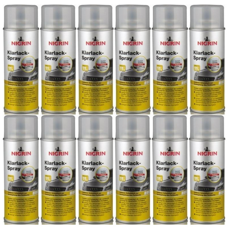NIGRIN Klarlack-Spray ist ein farbloser Schutzlack zur Versiegelung des Farblacks. Es haftet hervorragend auf durchgetrockneten Acryl-, Nitro- und Einbrennlackierungen und sorgt für brillanten Hochglanz. Darüber hinaus ist er zum Schutz der Oberfläche auch auf Metall, Holz oder lackierfähigem Kunststoff anwendbar. NIGRIN Klarlack-Spray kann zur Konservierung ganzer Lackflächen ebenso wie für partielle Lackreparaturen/ Ausbesserungsarbeiten eingesetzt werden.