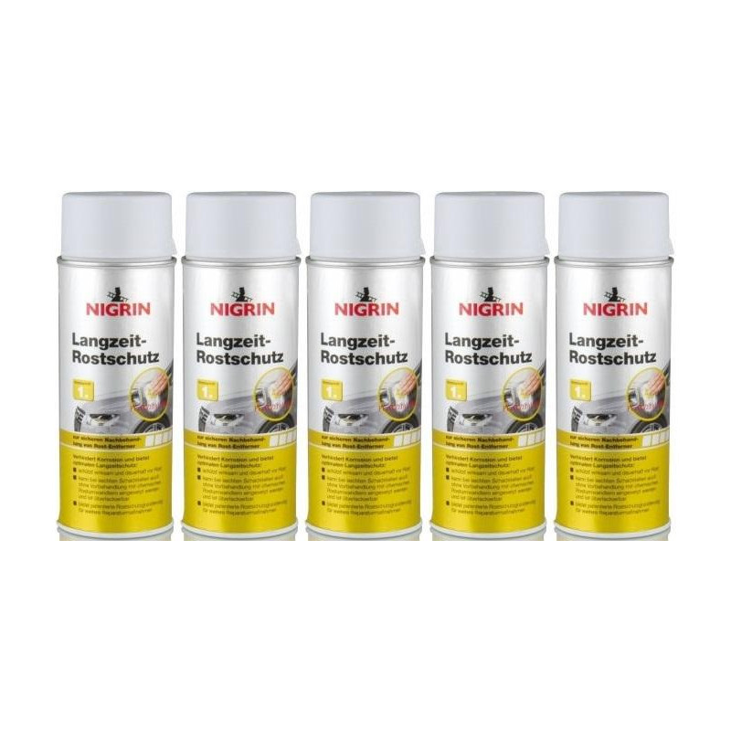 Die patentierte Rostschutzgrundierung NIGRIN Langzeit-Rostschutz bietet optimalen Langzeitschutz vor Korrosion. Sie eignet sich als sicheren Nachbehandlung von NIGRIN Rost-Entferner und kann bei leichten Rostschäden auch direkt ohne Vorbehandlung mit chemischen Rostumwandlern eingesetzt werden. NIGRIN Langzeit-Rostschutz verfügt über ausgezeichnete Füllkraft und ist blei- sowie chromatfrei. Darüber hinaus erleichert er Ihnen die Reparaturarbeit: er trocknet besonders schnell und ist bei Bedarf auch direkt überlackierbar. Der Farbton ist Grau, damit Sie leicht und sicher erkennen können, wo NIGRIN Langzeit-Rostschutz bereits angewendet wurde.
