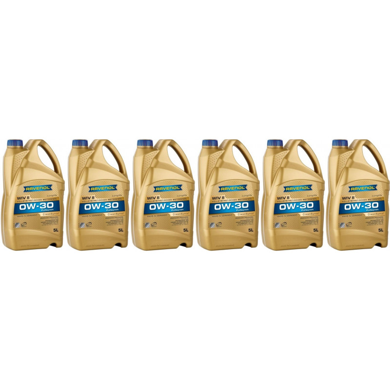 RAVENOL WIV SAE 0W-30 ist ein vollsynthetisches Leichtlauf-Motorenöl mit CleanSynto® Technologie für VW und Audi Otto- und Dieselmotoren (ab Modelljahr 2000 mit Wechselintervall-Verlängerung WIV) inklusive Pumpe-Düse-Motoren. Minimierung von Reibung, Verschleiß und Kraftstoffverbrauch, exzellente Kaltstarteigenschaften. Verlängerte Ölwechselintervalle gemäß Herstellervorschrift. Es ermöglicht deutlich längere Wartungsintervalle. Ausgezeichnete Kaltstarteigenschaften durch eine schnellere Durchölung des Systems. Gewährleistet sind verringerte Reibungsverluste und hohe Ölfilmstabilität sowie ein hervorragendes Viskositäts-Temperaturverhalten.